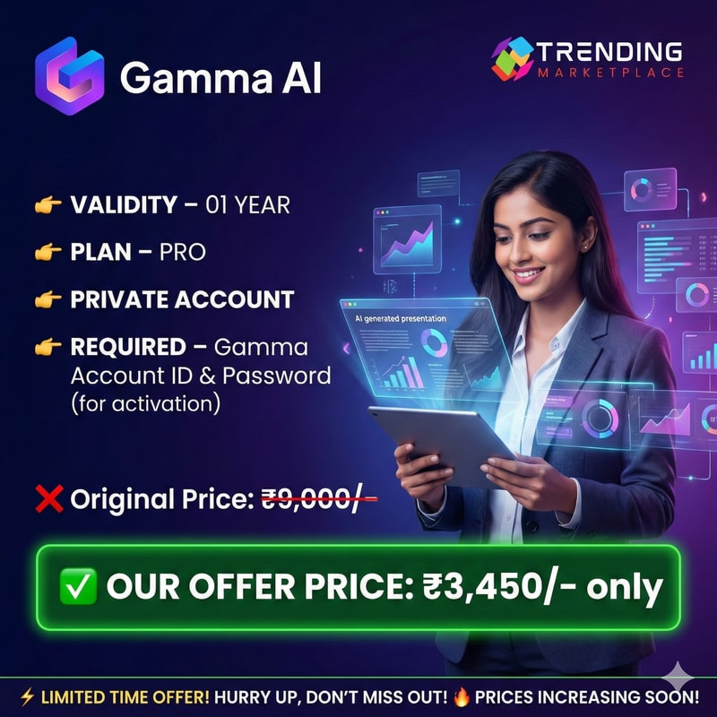 🤖 Gamma.AI – NOW AVAILABLE 🤖 👉🏻 VALIDITY – 01 YEAR 👉🏻 PLAN – PRO 👉🏻 PRIVATE ACCOUNT 👉🏻 REQUIRED – Gamma Account ID & Password (for activation) ❌ Original Price: ₹9,000/- ✅ OUR OFFER PRICE: ₹3,450/- only 📌 KEY FEATURES: ✅ Unlimited AI Creation 🖼️ Premium AI Image Generation ✍️ Advanced AI Editing 📊 Generate up to 60 Cards 🔠 Custom Fonts 🌐 Custom Domains & URLs 🔐 Password Protection 📈 Detailed Analytics 🔍 100,000 AI Token Inputs ➕ Everything included in Plus Plan & more 🌐 Official Website: https://www.gamma.app