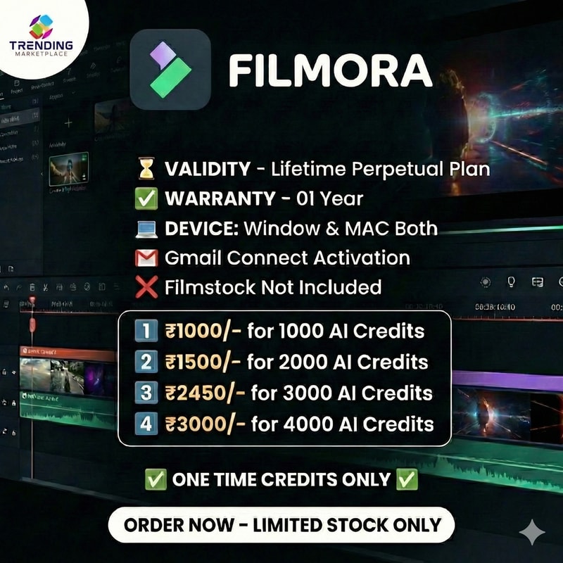 📽 FILMORA NOW AVAILABLE 📽 🔥 PLAN - Perpetual Plan ⌛ VALIDITY - Lifetime ✔️ WARRANTY - 01 Year 💻 DEVICE: Window & MAC Both 📧 Gmail Connect Activation ❌ Filmstock Not Included 1️⃣ ₹1000/- for 1000 AI Credits 2️⃣ ₹1500/- for 2000 AI Credits 3️⃣ ₹2450/- for 3000 AI Credits 4️⃣ ₹3000/- for 4000 AI Credits ✅ ONE TIME CREDITS ONLY ✅